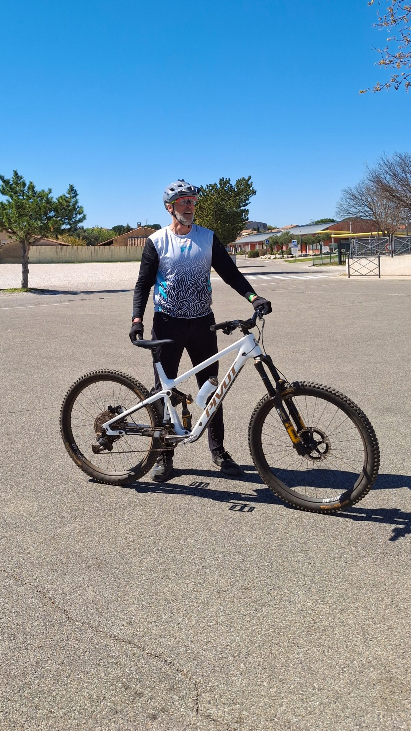 Dans l’après-midi, je fais 5 descentes, donc 8 au total sur la journée. C’est trop cool ! Et alors ce Pivot Cycles Phoenix, quel régal ! Il ne fait pas un bruit ! Je n’ai pas beaucoup roulé en DH avant la course, seulement 2 demi-journées, et je finis encore de régler la fourche Öhlins. Je pense à plein de trucs quand je roule, mes traj’, mes réglages, ce que je dois raconter au micro… etc Quand dans la 3è descente de l’après-midi, j’arrive plein fer sur le roadgap en m’imaginant qu’il s’agit de la table suivante, celle avec le plateau en bois entre les bosses de terres, j’arrive sur l’appel et je ne reconnais pas le saut. Écran bleu…