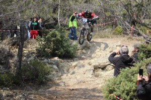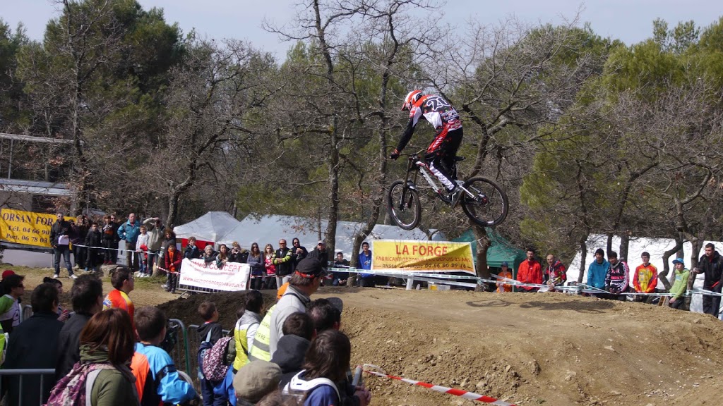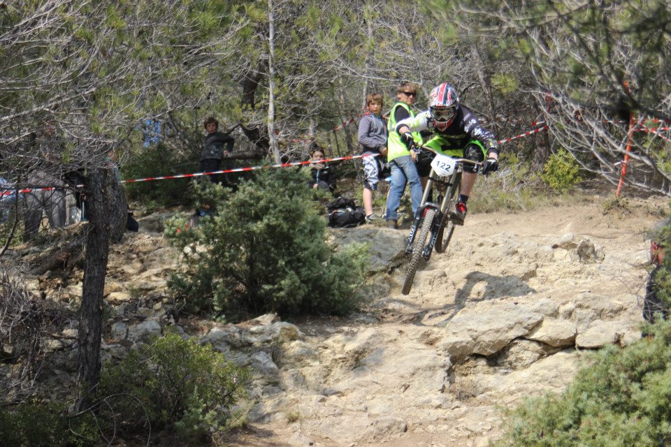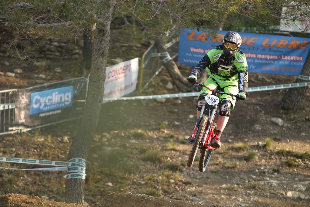 Côté pilotes et teams, pour une course régionale, vous comprendrez mon titre de « Championnat du Monde du Languedoc-Roussillon »: le Team TBT (Aurélien Giordanengo et Faustin Figaret), le Team VoulVoul Racing (Rudy et Marine Cabirou, Romain Goulesque, Jean-Didier Payet..), le Team Ride Inov (Alexandre Fayolle, Thibaut Martin, Kevin Locquet, Bastien Masnou), le Team SRC (avec, notamment, Charles Pujol), le Team Sodicycle (Quentin Chanudet, Luca Frigout) d’autres excellents pilotes venus individuellement: Julien Piccolo (Team X1 Racing – en photo au dessus), Ivan Oziol, Arthur Parret… et cerise sur le gâteau, Morgane Charre, notre Championne du Monde de DH était là aussi ! (j’ai même aperçu, sur le côté de la piste, l’enduriste Simon André, notre ancien descendeur de l’équipe de France Vincent Saut et aussi le prometteur pilote du Team Scott 11 Patrick Thome… A mon avis, ils venaient me voir rouler ?! Non ?!)