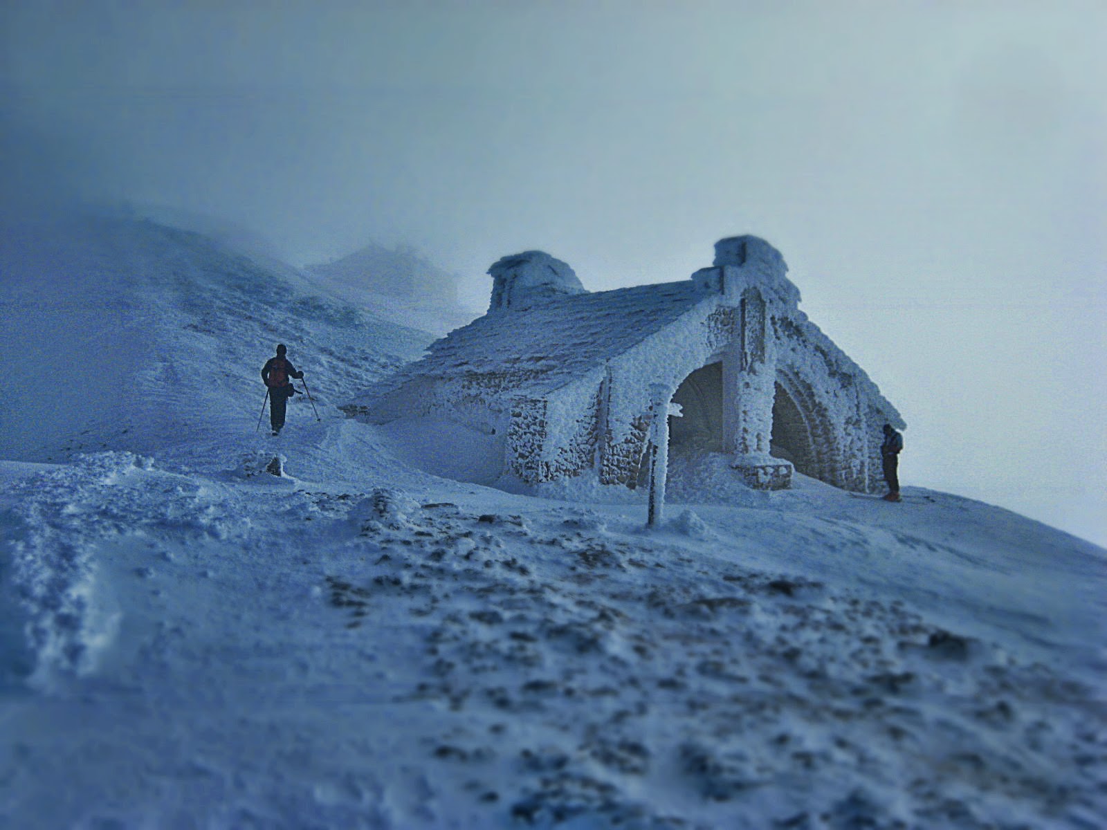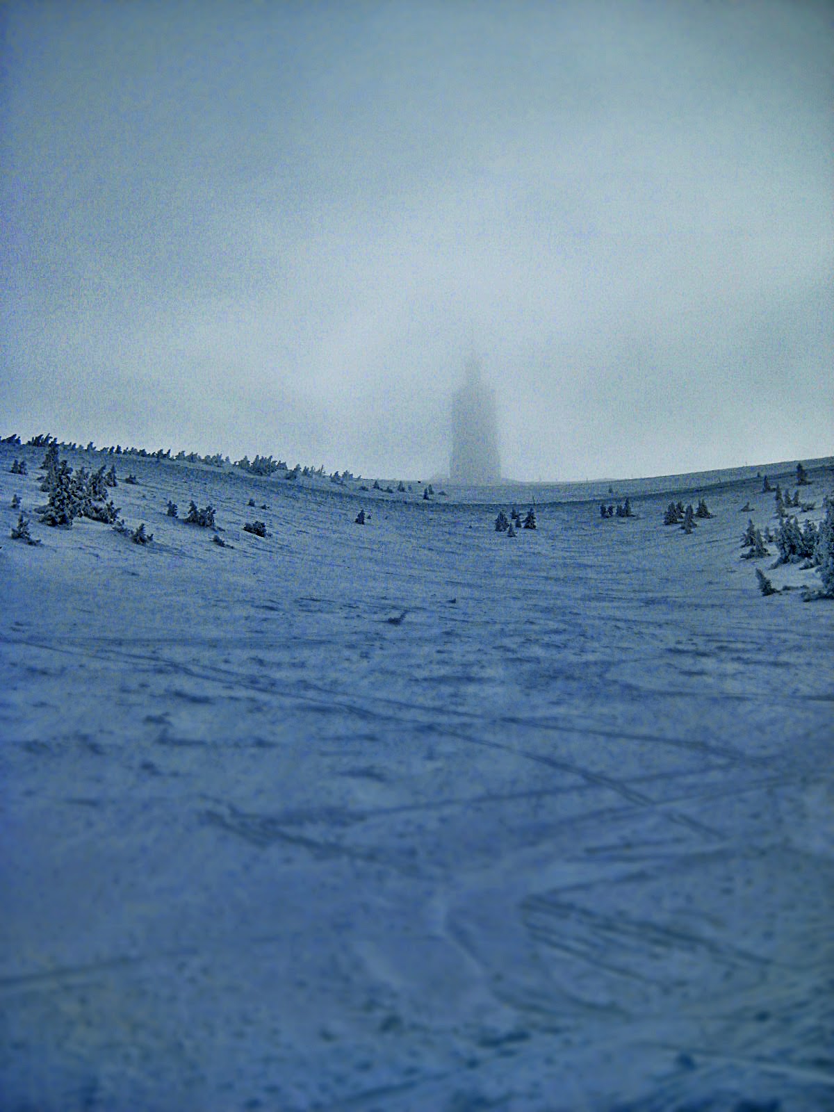Lorsque j’arrive au niveau de la Chapelle Sainte-Croix, lieu de mon abandon en 2014, la visibilité n’est pas des meilleures mais le vent n’est pas trop méchant… L’antenne, le sommet, sont là, à 150m, pourtant je ne la vois toujours pas… Je suis les traces des gars qui me précèdent:
