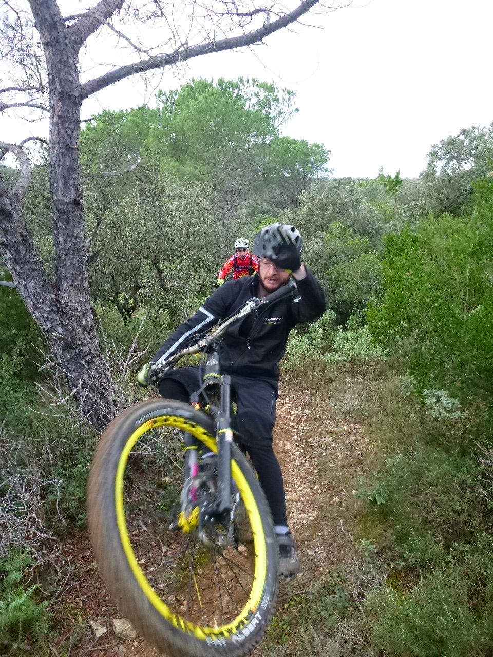 Après une belle première partie dans les bois du nord de Chusclan, on passe un peu au soleil (déjà de retour après les pluies de la nuit !) dans les champs de vignes et chaque virages dans le sable et l’occasion de faire des gros travers pour Romain et Kevin. Sur les routes, Romain se lâche en manuals…