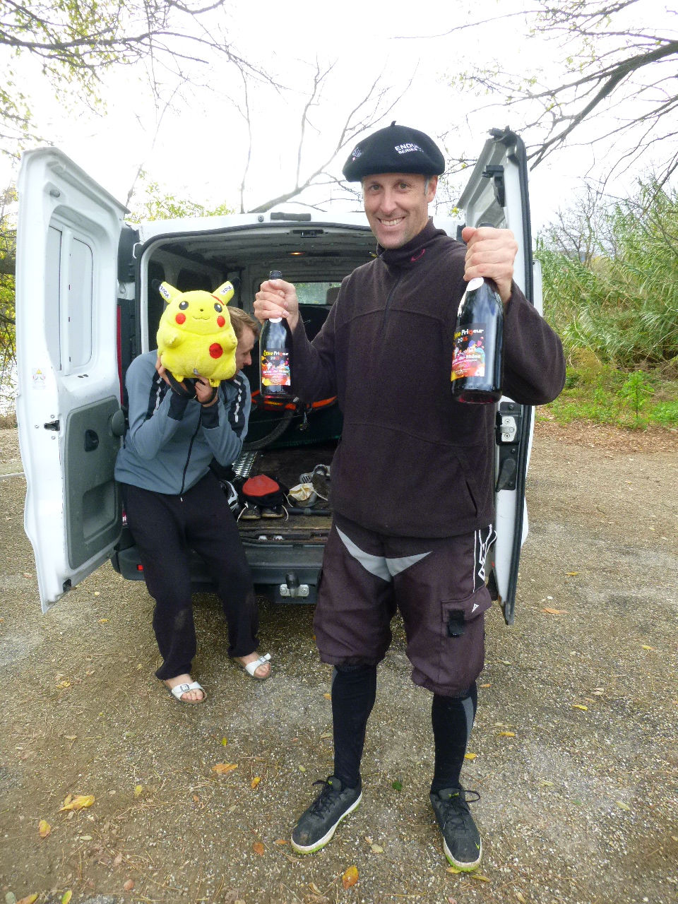 Romain et Benji, avec leurs sacs Pikachu (pourvus d’un zgeg chacun) prennent un peu plus le rythme après les 10km d’échauffement. Romain à sorti sa vieille tenue de l’Équipe de France de DH alors il se doit de l’honorer !