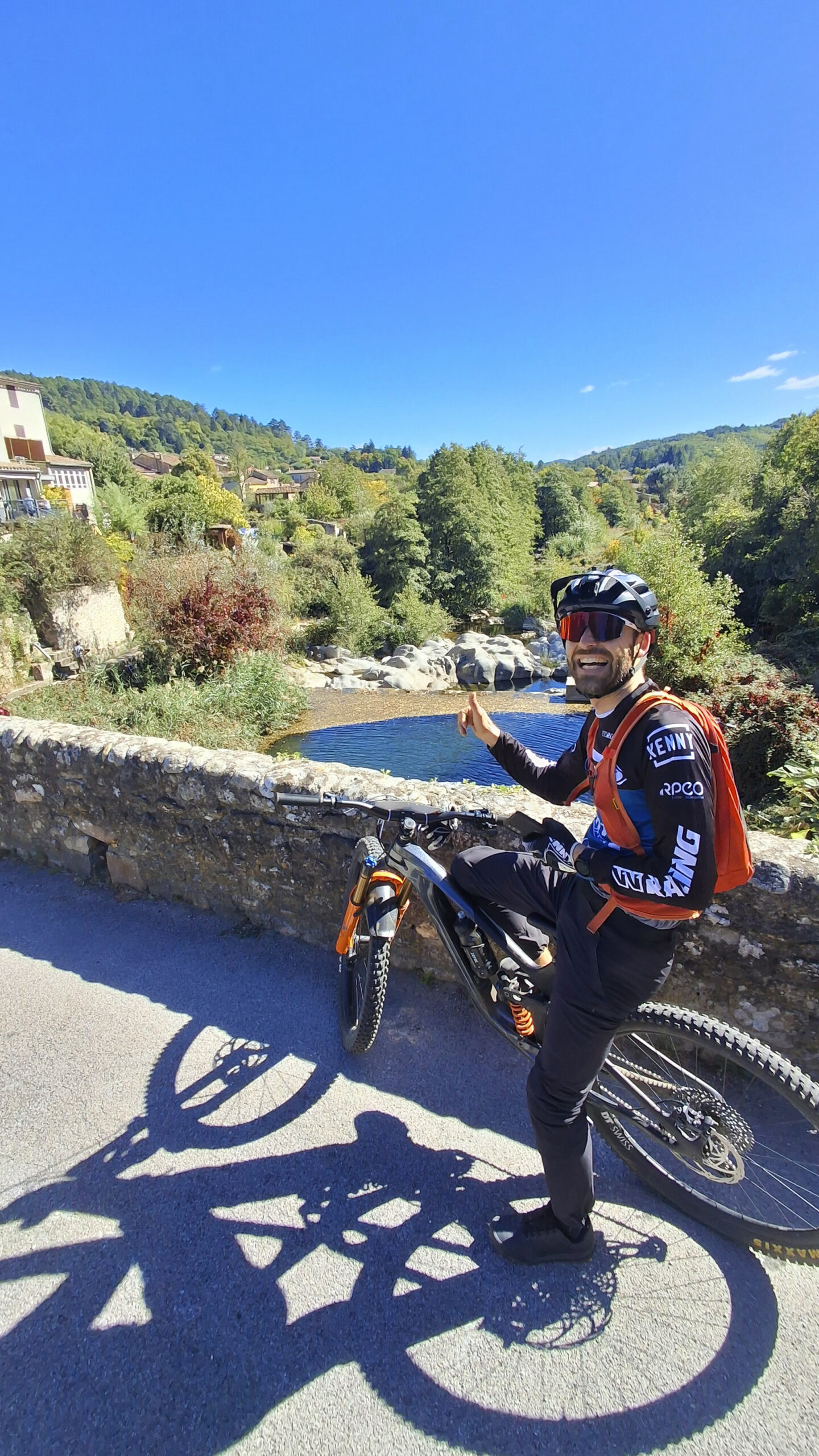 Plus qu’une dernière liaison, bien longue, toujours avec les E-bikes, et c’est la Spéciale 7 qui redescend au village, au bord de la rivière. Elle est super même si le coup de cul du milieu, qui passe sur les cailloux, me flingue les pattes. Mais ensuite, c’est du régal dans la pente ! Ça secoue et je roule avec Nicolas qui enchaine bien les derniers toboggans dans la poussière.