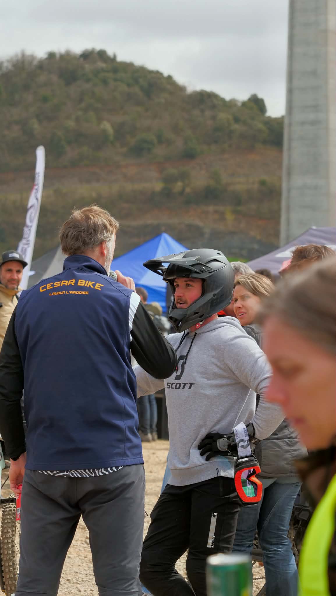 En bas, je passe la ligne et je reviens direct pour prendre le micro. Ce n’est pas facile à gérer pour Thibaud et moi, parce qu’il y a pas mal d’arrêts de courses. Des gens nous demandent ce qu’il se passe mais on n’a pas de radio, on ne sait pas tout, on ne peut pas toujours répondre. Mais en tous cas, quand ça roule, je trouve qu’on se complète bien et quand les meilleurs passent, c’est le feu ! C’est du pur plaisir de commenter une telle épreuve !