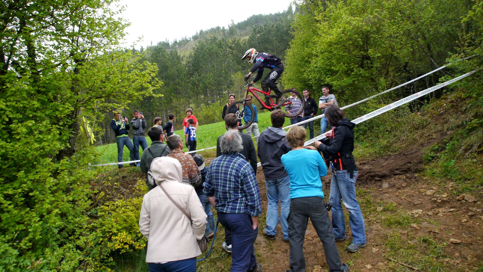 Pour eux, les conditions humides ne semblent pas avoir les mêmes effets que la majorité des autres pilotes… Le haut du spot se fait « pieds clipsés », le road-gap d’entrée de la forêt semble être une « formalité »… WTF !!!