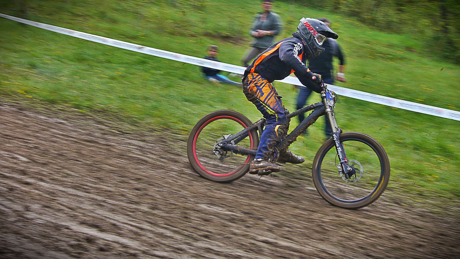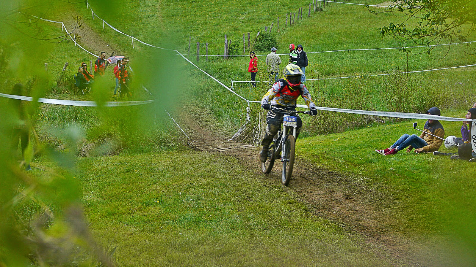 Pour la descente de reconnaissance avant le premier run, sur la partie haute, on a l’impression qu’un troupeau de vache a remonté la piste, ou que le paysan du coin a passé la charrue. Il y a des paquets de boue partout et on se croirait pendant la guerre de tranchées. D’entrée de jeu, ça « bourre » et avant la fin de la première partie, ma roue arrière ne tourne plus… Quelle galère !