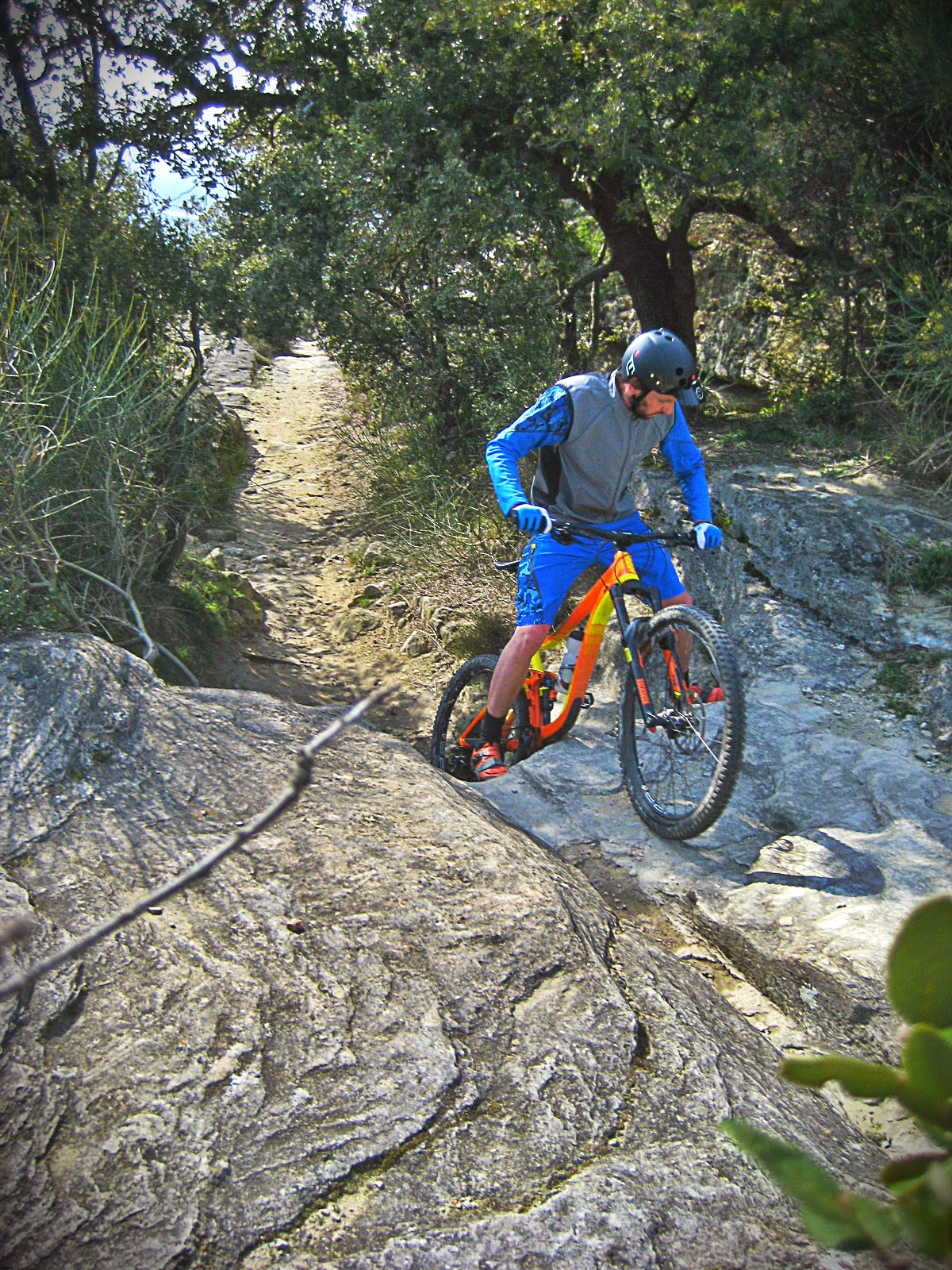 Après une nouvelle petite liaison, on se retrouve dans le village et on descend en dessous pour remonter derrière… Là, le dernier départ nous attend. Pour cette Spéciale 4, le départ est bien marqué (le dimanche) avec un tapis rouge et les drapeaux de la Nation… Quel sentiment de fierté en partant ! hahahaha Par contre après, c’est tout plat pendant un bon moment et on a l’impression de pédaler comme Greg Lemond, tout en regrettant le moteur électrique de Fabian Cancellara ! On passe au dessus du Château de Beaucet et vers la fin, on descend sur une partie rocailleuse et un peu plus technique…